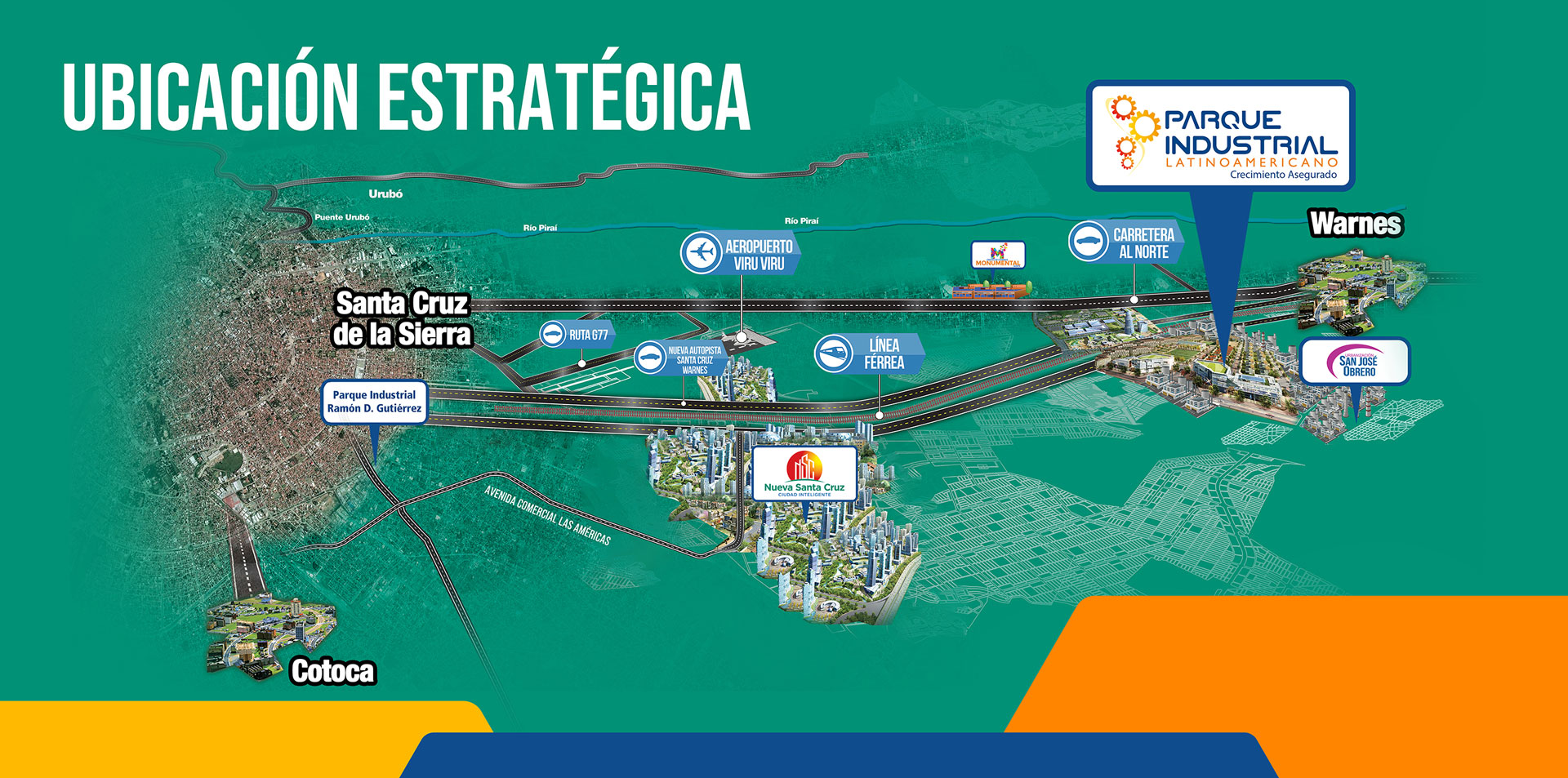 - La Ciudad Nueva Santa Cruz, la ciudad de ensueño de Latinoamérica, agradable, saludable y espaciosa, moderna e inteligente, con una capacidad habitacional que favorecerá a 100 mil familias, el establecimiento de 10 mil empresas y una estimación de 370 mil habitantes. Esta imponente ciudad, abarcará una superficie total de 6.000 hectáreas distribuidas en: 3.000 hectáreas para uso residencial y vivienda; 700 hectáreas para espacios comerciales y de negocios; y 2.300 hectáreas para infraestructura urbana.